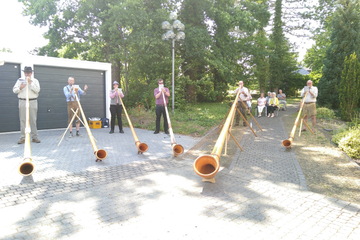 Bad Sassendorf, 27.06.2021 I Die Seniorinnen und Senioren der Residenz Am Malerwinkel in Bad Sassendorf trauten am Sonntagnachmittag ihren Augen und Ohren nicht. Sechs Musiker der Gruppe Haarstrang-Alphornisten hatten sich vor dem Gebäude mit ihren fast vier Meter langen Alphörnern in Position gebraucht. Fast 1 ½ Stunden entlockten sie den für Westfalen etwas seltsam anmutenden Instrumenten nicht nur Töne, sondern zahlreiche fröhliche Lieder wie Amazing Grace, Schützenfest-Klassiker und Alpines zur Freude der Bewohner. Diese lauschten bei schönstem Sommerwetter den ungewohnten Klängen der Alphörner, die in der Schweiz ein Nationalsymbol sind.