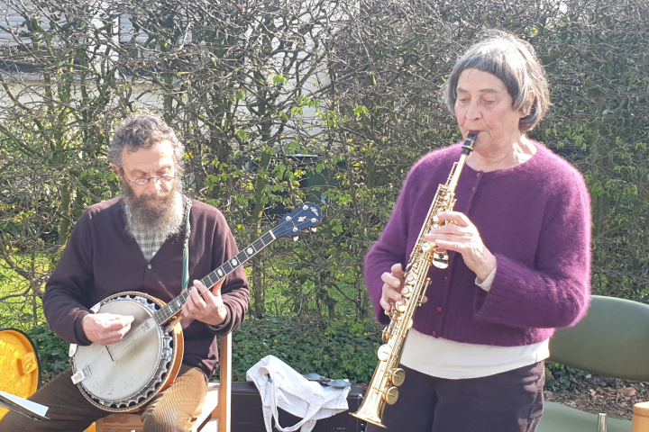Bad Sassendorf, 20.04.2021 I Die Reihe “Kultur am offenen Fenster” der Bürgerstiftung Hellweg-Region wurde diese Woche in Bad Sassendorf fortgesetzt. In die Gärten der beiden Cura-Häuser bringt das Ehepaar Troike bringt ein Banjo mit, eine Klarinete und ein Sopransaxophon. Traditionelle Jazz Musik steht auf dem Programm, auch Old Time Jazz genannt, der sich vor allem durch die eingestreuten Improvisationen auszeichnet. Zum Beispiel der jiddische Titel “Bei mir bist du schön” aus dem New York von 1932. Er wurde das Markenzeichen der Andrew Sisters und fand dann zahllose Interpreten von Ella Fritzgerald über Benny Godman bis zu Zarah Leander. Die Musiker spielen im Garten unter den Balkonen und fühlen sich wie vor den Königslogen in großen Theatern. Es macht sichtlich Spaß, endlich mal wieder vor Publikum zu spielen und der Funke springt über, das Publikum geht mit und fordert Zugaben.