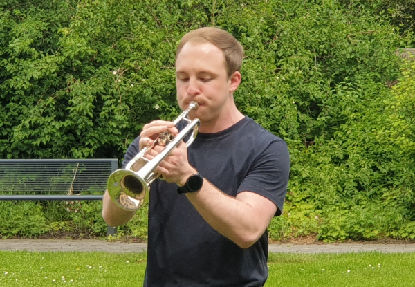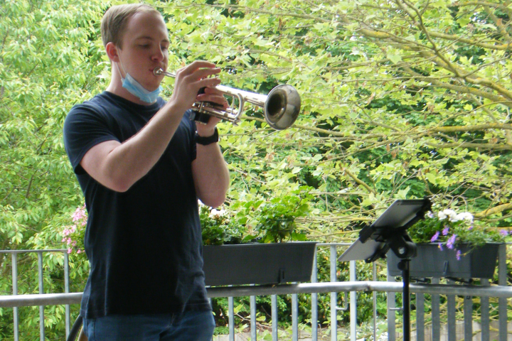 Werl, 05.06.2021 | Die musikalische Reihe „Kultur am offenen Fenster“ der Bürgerstiftung Hellweg-Region wurde nun erstmalig in einem Seniorenheim in Werl fortgesetzt. Am vergangenen Samstag spielte der Trompeter Julian Knop an verschiedenen Stellen des Seniorencentrums St. Michael. Zahlreiche Bewohner und Bewohnerinnen lauschten dem Konzert mit voller Freude. Das Repertoire von Julian Knop war vielfältig und reichte über Jazz, Volkslieder aber auch Pop-Musik. Bei „Mein kleiner grüner Kaktus“ oder „Wochenende Sonnenschein“ stimmten sogleich einige Bewohner und Bewohnerinnen mit ein. Auch der Trompeter, Julian Knop, genoss es, in der Senioreneinrichtung St. Michael endlich wieder einmal vor Publikum spielen zu dürfen und gleichzeitig dort für Abwechslung zu sorgen.