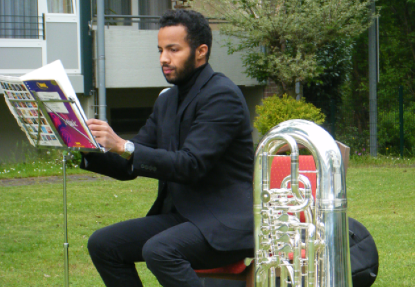 Rund um das Wohn- und Pflegezentrum herum erfreute Jamal Bouknouch auf seiner Tuba die Bewohner, die bei geöffneten Fenstern dem Musikgenuss lauschten. Frau Buschhaus (ehrenamtliche Mitarbeiterin der Bürgerstiftung) äußert sich begeistert „Das ruhige „Air“ von Bach harmonisiert mit dem Zwitschern der Vögel des nahen Waldes und löst sogleich Entspannung bei den Zuhörern aus. Der weiche Klang der Tuba lässt sich nicht nur mit den Ohren, sondern mit dem ganzen Körper hören.“