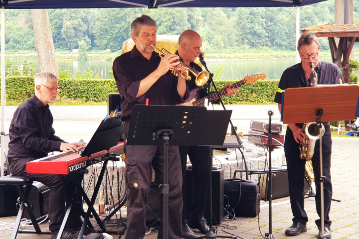 Möhnesee, 09.07.2021 I Zum Abschluss der erfolgreichen Reihe „Kultur am offenen Fenster“ der Bürgerstiftung Hellweg-Region spielt die 4-köpfige Easy-Jazz-Band aus Soest im Senioren- und Pflegeheim Haus Müller in Möhnesee-Günne.