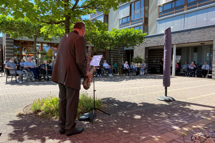 Den Auftakt hat am 02.03.2021 Patrick Porsch auf seinem Saxophon am St. Antonius Seniorencentrum gemacht. An verschiedenen Außenstellen des Seniorencentrums begeisterte er mit Frühlingsliedern und Evergreens. Die Bewohner lauschten bei geöffneten Fenstern und freuten sich über den Musikgenuss. Das musikalische Grußwort im Sinne von „Wir denken an euch“ war ein Volltreffer der guten Laune.