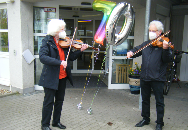 Seit drei Jahren freut sich Agnes Kirmes auf ihren 70. Geburtstag. Das ist ein biblisches Alter für Menschen mit Down-Syndrom! Dieser sollte eigentlich im Rahmen einer großen Geburtstagsparty gefeiert werden. Coronabedingt musste die große Feier leider ausfallen. Daher suchte das Team vom Walpurgis-Haus im Soester Norden nach einer anderen Überraschung. Da kommt das Projekt der Bürgerstiftung “Kultur am offenen Fenster” gerade recht. Agnes Kirmes wurde von den beiden Violinisten Elisabeth Schwenkhagen und Rüdiger Alkert mit einem Geburtstagsständchen überrascht.